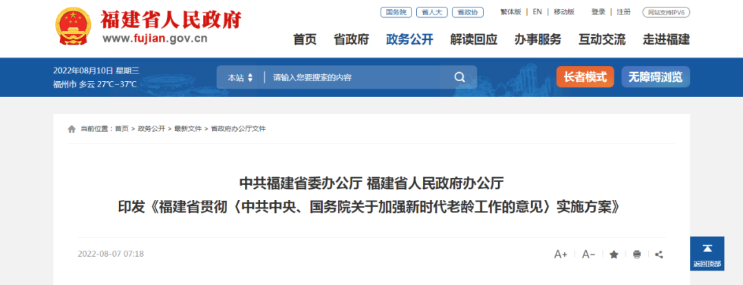 《福建省貫徹〈中共中央、國務(wù)院關(guān)于加強(qiáng)新時代老齡工作的意見〉實(shí)施方案》公布如下:
