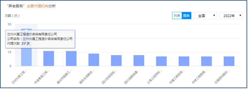 據(jù)采招網(wǎng)數(shù)據(jù)中心統(tǒng)計顯示,2022年上半年“養(yǎng)老服務(wù)”項目的相關(guān)代理機構(gòu)中:蘭州興晟工程造價咨詢有限責(zé)任公司(27次)、中金泰富工程管理有限公司(11次)、嘉興市銀建工程咨詢評估有限公司(11次)代理次數(shù)較多,起到了至關(guān)重要的作用。
