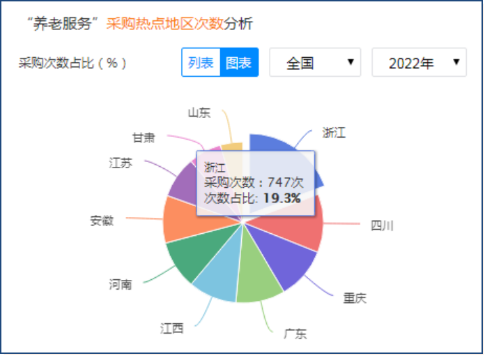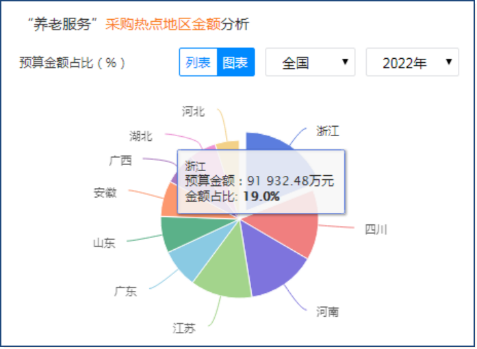 從采購地區(qū)來看,2022年上半年全國“養(yǎng)老服務(wù)”的招標市場中,招標次數(shù)前三名的省份:浙江、四川、重慶;浙江省招標次數(shù)747次(占比全國的19.3%)、四川省招標次數(shù)454次、重慶市招標次數(shù)405次。招標金額前三名的省份:浙江、四川、河南;浙江省預(yù)算金額為91932.48萬元(占比全國的19%)、四川省預(yù)算金額為69722.89萬元、河南省預(yù)算金額為68054.59萬元。