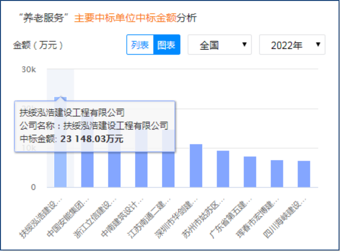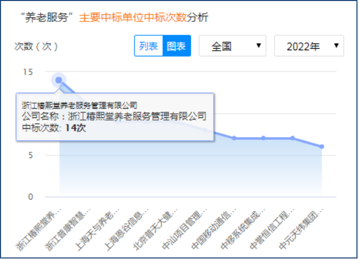 從中標單位來看,中標頻率前三的企業(yè):浙江椿熙堂養(yǎng)老服務(wù)管理有限公司(中標14次)、浙江普康智慧養(yǎng)老產(chǎn)業(yè)科技有限公司(中標11次)、上海天與養(yǎng)老服務(wù)有限公司(中標9次);中標金額前三的企業(yè):扶綏泓浩建設(shè)工程有限公司(23148.03萬元)、中國安能集團第二工程局有限公司(18454萬元)、浙江立信建設(shè)集團有限公司(17089.7萬元)。