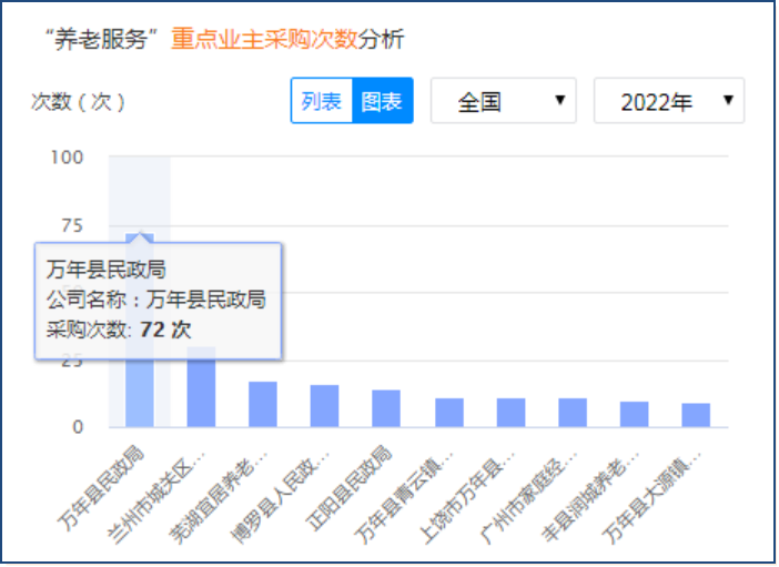 2022年上半年“養(yǎng)老服務(wù)”項目中,從采購次數(shù)前十的業(yè)主單位可以看出,招標頻率較高的業(yè)主單位有萬年縣民政局(招標72次)、蘭州市城關(guān)區(qū)民政局(招標30次)、蕪湖宜居養(yǎng)老服務(wù)有限公司(招標17次)等;從采購金額前十的業(yè)主單位來看,招標金額前三的業(yè)主單位有扶綏樂養(yǎng)資產(chǎn)經(jīng)營管理有限公司(27482.9萬元)、鄒平市黛溪街道辦事處(18454萬元)、烏鎮(zhèn)實業(yè)(桐鄉(xiāng))有限公司(17344.7萬元);