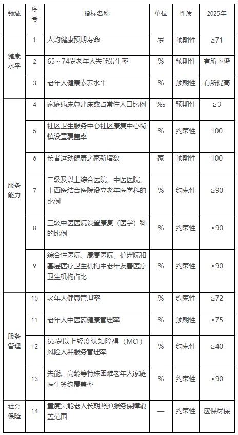 到2025年,老年健康服務(wù)體系進一步完善,老年健康保障制度更加健全,老年人健康生活的社會環(huán)境更加友善,老年健康服務(wù)供給有效增加,服務(wù)資源配置更趨合理,老年健康服務(wù)質(zhì)量有效提升,老年人健康水平不斷提高,健康預(yù)期壽命不斷延長。