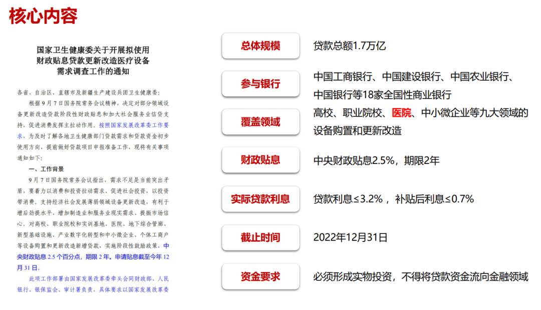 9月7日,國務(wù)院召開常務(wù)會議,主題為“決定對部分領(lǐng)域設(shè)備更新改造貸款階段性財政貼息和加大社會服務(wù)業(yè)信貸支持,促進消費發(fā)揮主拉動作用”,9月23日《國家衛(wèi)生健康委關(guān)于開展擬使用財政貼息貸款更新改造醫(yī)療設(shè)備需求調(diào)查工作的通知》發(fā)布,這些政策不是專門為疫情防控建醫(yī)院準備的,專家預計,大約有2000億能分到醫(yī)療板塊。
