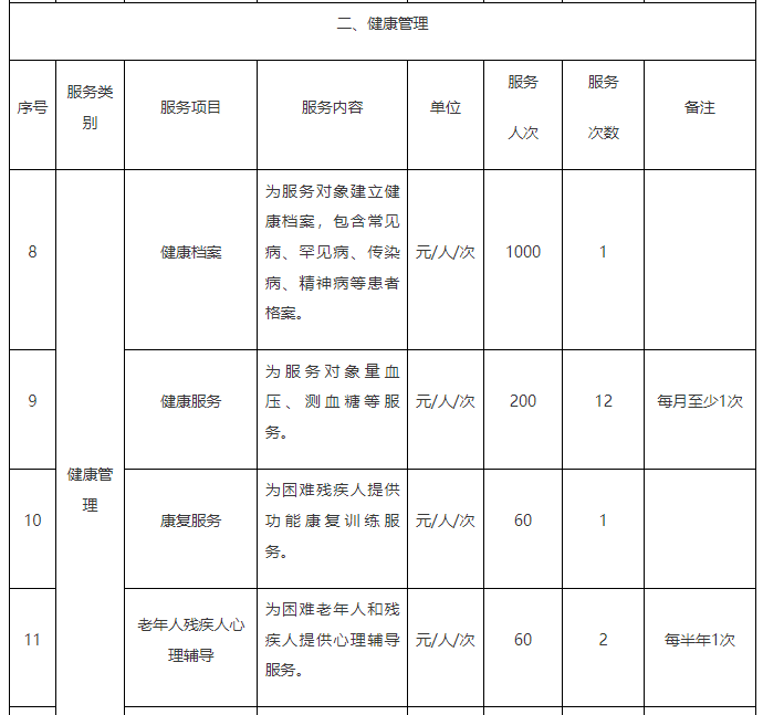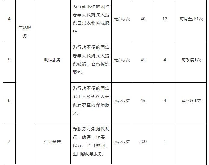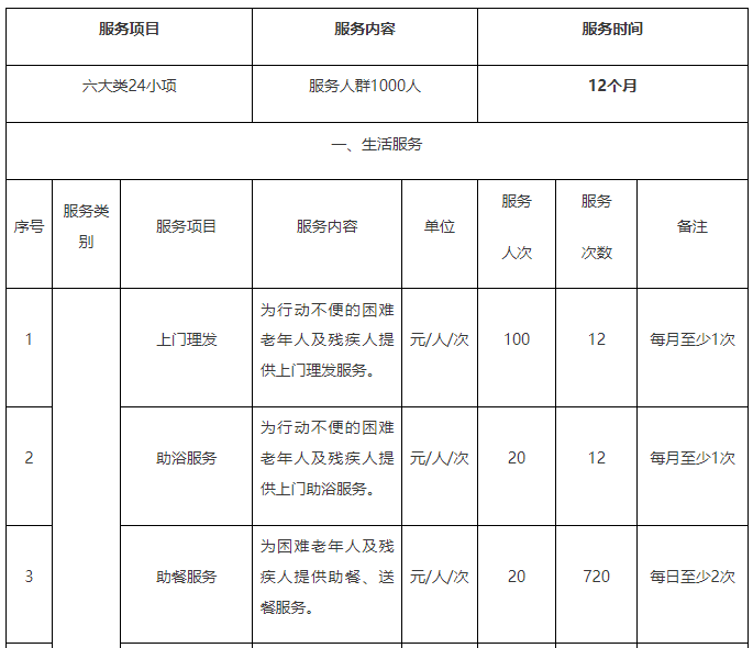 采購需求:對全區(qū)農(nóng)村經(jīng)濟困難老年人和農(nóng)村分散供養(yǎng)的特困人員定期主動上門開展生活照料等綜合服務(以下為部分服務項目)。