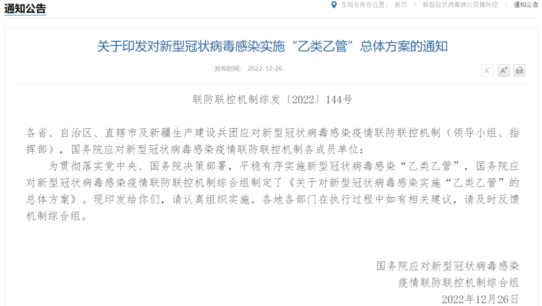 中國國務(wù)院聯(lián)防聯(lián)控機(jī)制綜合組26日印發(fā)《關(guān)于對(duì)新型冠狀病毒感染實(shí)施“乙類乙管”的總體方案》。方案指出,2023年1月8日起,對(duì)新型冠狀病毒感染實(shí)施“乙類乙管”,其中對(duì)老年人、養(yǎng)老機(jī)構(gòu)疫情防控措施作出新要求: