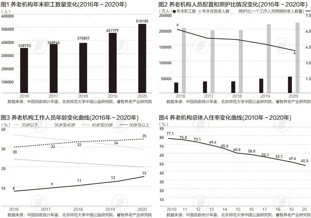 從人員配置上來看,這十年,養(yǎng)老機(jī)構(gòu)照護(hù)比(一個(gè)工作人員照顧的老人數(shù)量)提高:從2016年的平均6位老人配備一名工作人員轉(zhuǎn)變?yōu)?020年的平均4位老人配備一名工作人員。