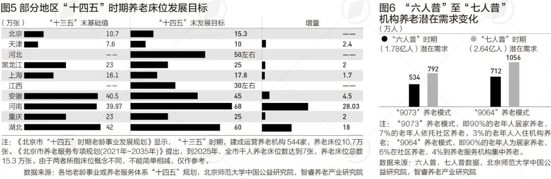 從“六人普”到“七人普”數(shù)據(jù)看,按照“9073”養(yǎng)老模式(居家養(yǎng)老、社區(qū)養(yǎng)老與機(jī)構(gòu)養(yǎng)老的人數(shù)占比分別為90%、7%和3%)推算,機(jī)構(gòu)養(yǎng)老的總體需求從534萬人增長到792萬人,增加258萬人;按照“9064”養(yǎng)老模式(居家養(yǎng)老、社區(qū)養(yǎng)老與機(jī)構(gòu)養(yǎng)老的人數(shù)占比分別為90%、6%和4%)推算,機(jī)構(gòu)養(yǎng)老的總體需求從712萬人增長到1056萬人,同比增加344萬人。