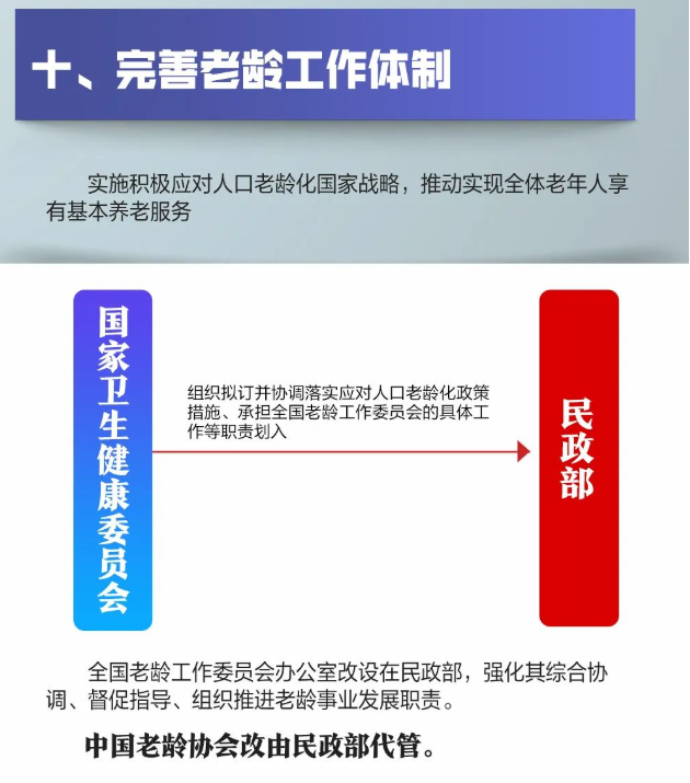 根據(jù)國務院關(guān)于提請審議國務院機構(gòu)改革方案的議案,完善老齡工作體制。實施積極應對人口老齡化國家戰(zhàn)略,推動實現(xiàn)全體老年人享有基本養(yǎng)老服務,將國家衛(wèi)生健康委員會的組織擬訂并協(xié)調(diào)落實應對人口老齡化政策措施、承擔全國老齡工作委員會的具體工作等職責劃入民政部。全國老齡工作委員會辦公室改設在民政部,強化其綜合協(xié)調(diào)、督促指導、組織推進老齡事業(yè)發(fā)展職責。