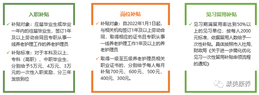 5月10日,西安市民政局、市財政局、市人力資源和社會保障局聯(lián)合出臺《關(guān)于落實養(yǎng)老護理員相關(guān)補貼政策的通知》,分別明晰了入職補貼、崗位補貼、見習留用補貼,其中,入職補貼3-5萬元,崗位補貼300-700元。