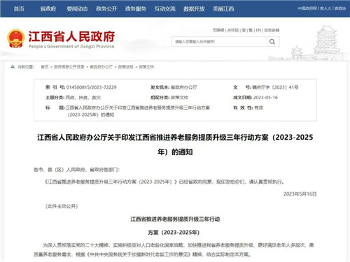 為加快推進(jìn)養(yǎng)老服務(wù)提質(zhì)升級(jí),更好滿足老年人多層次、高質(zhì)量養(yǎng)老服務(wù)需求,近日,江西省人民政府辦公廳印發(fā)了《關(guān)于印發(fā)江西省推進(jìn)養(yǎng)老服務(wù)提質(zhì)升級(jí)三年行動(dòng)方案(2023-2025年)的通知》(以下簡(jiǎn)稱《通知》)。