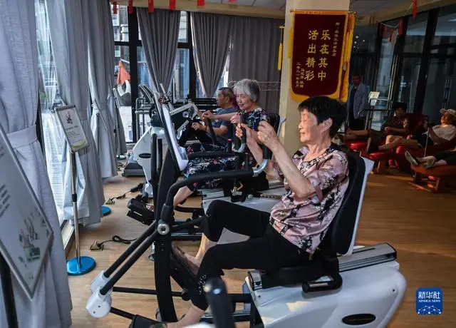 6月14日,在嘉興市南湖區(qū)新嘉街道電子社區(qū)鄰里中心的長者運(yùn)動健康之家內(nèi),老人們在進(jìn)行器械鍛煉。