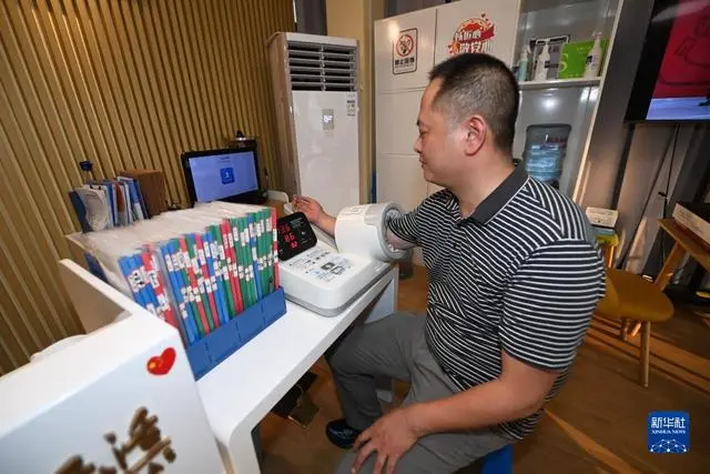 6月14日,在嘉興市南湖區(qū)新嘉街道電子社區(qū)鄰里中心的長者運(yùn)動健康之家內(nèi),居民在測量血壓。