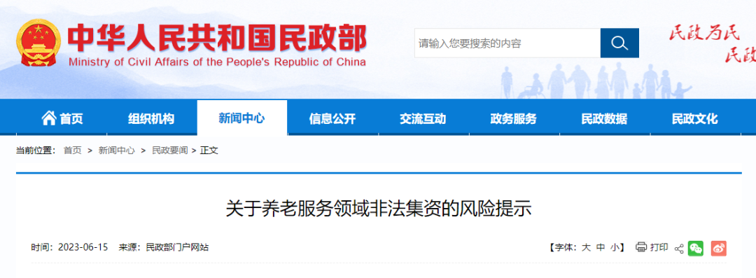 民政部發(fā)布《關于養(yǎng)老服務領域非法集資的風險提示》