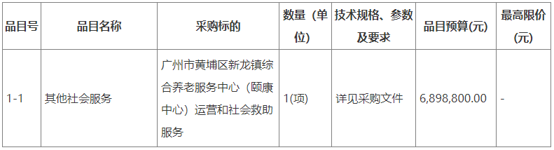 項目名稱:廣州市黃埔區(qū)新龍鎮(zhèn)綜合養(yǎng)老服務中心(頤康中心)運營和社會救助服務項目