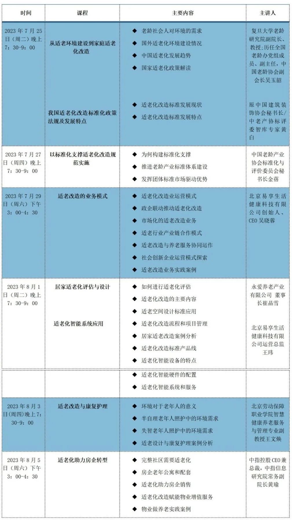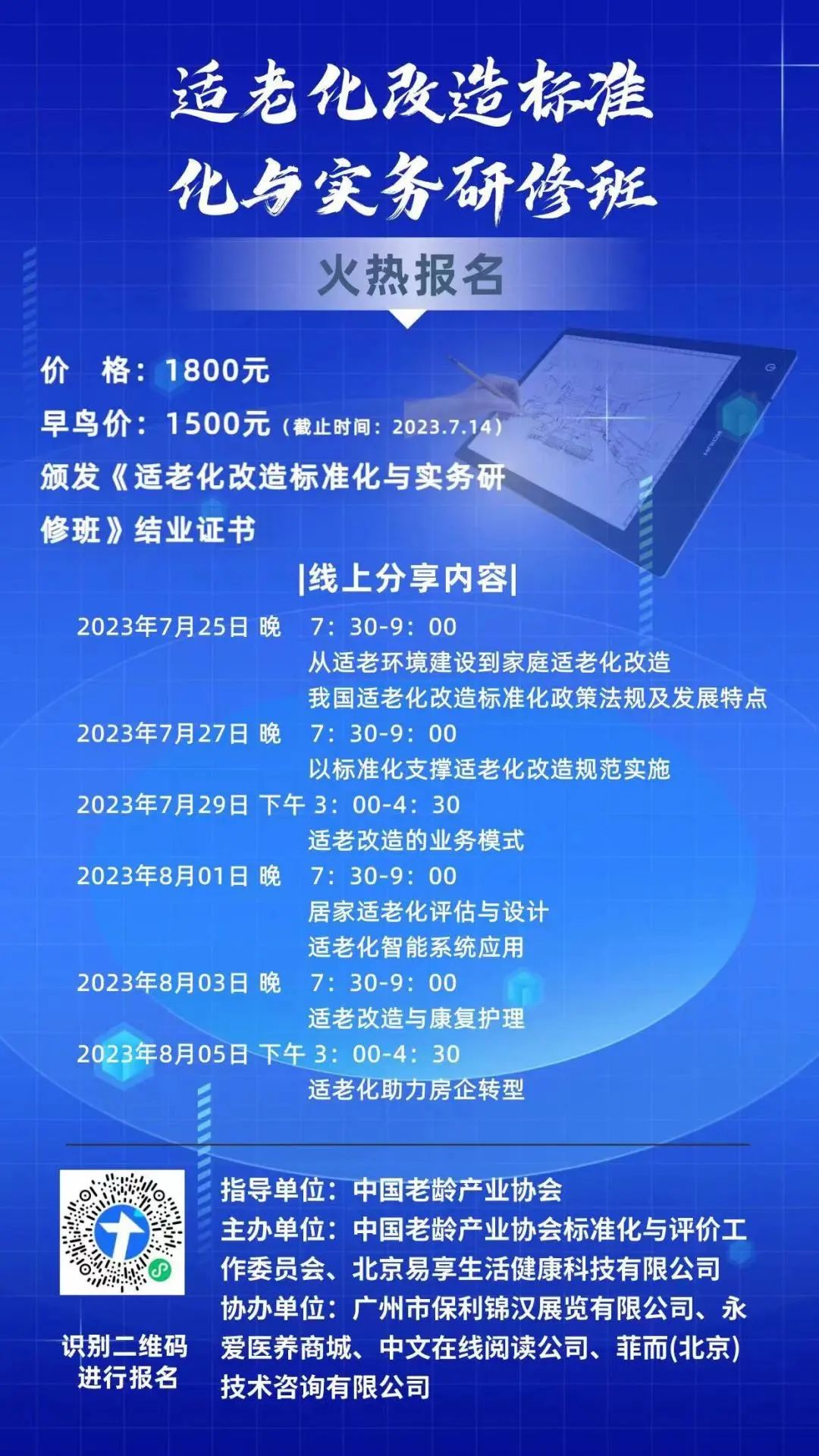 如果您是適老化改造業(yè)務(wù)負(fù)責(zé)人、市場拓展人員、設(shè)計管理人員、項(xiàng)目管理運(yùn)營人員;裝修設(shè)計師、項(xiàng)目管理;康養(yǎng)房企銷售負(fù)責(zé)人、設(shè)計負(fù)責(zé)人、物業(yè)管理人員;居家養(yǎng)老護(hù)理機(jī)構(gòu)負(fù)責(zé)人;政府機(jī)關(guān)老齡工作負(fù)責(zé)人;機(jī)關(guān)老干部處及工會、婦聯(lián)負(fù)責(zé)人、高等院校涉老專業(yè)教師,請您不要錯過本次研修班,我們期待您的參與!