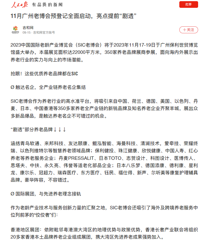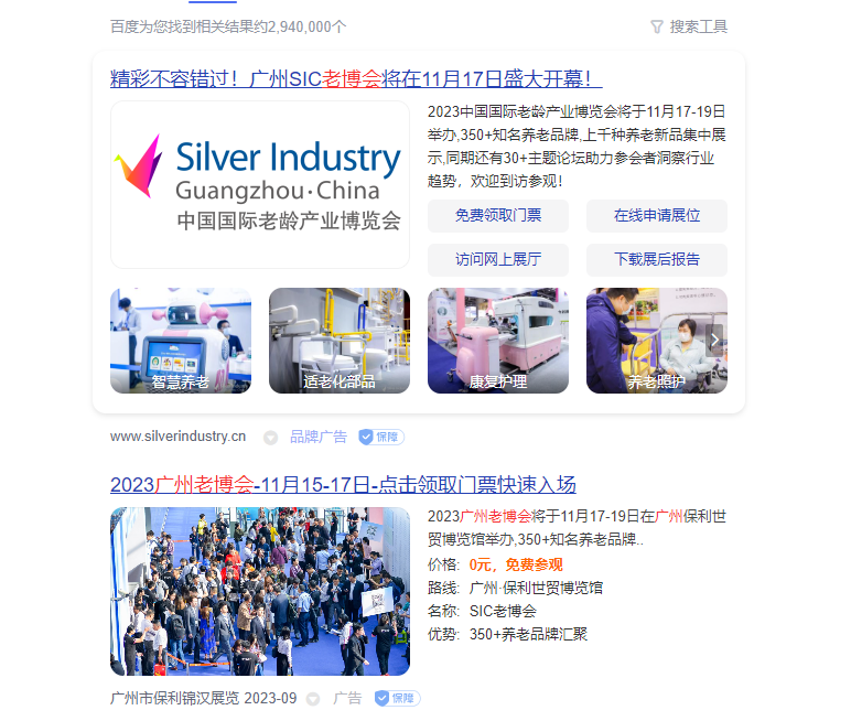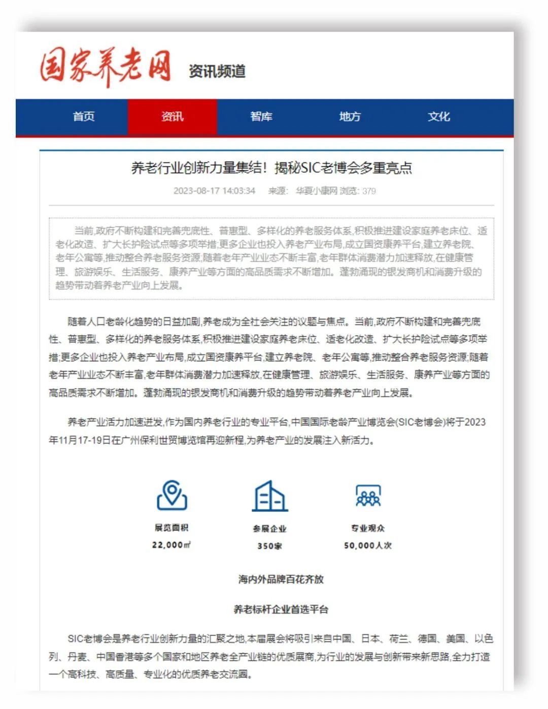 2023中國國際老齡產(chǎn)業(yè)博覽會(SIC老博會)將于2023年11月17-19日在廣州保利世貿(mào)博覽館舉辦,為持續(xù)推動展會觸達(dá)更多品牌及專業(yè)觀眾,挖掘更多潛在買家,同時更好地為參展商進(jìn)行品牌賦能,SIC老博會打通全平臺營銷矩陣,通過線上+線下聯(lián)動造勢,已全面鋪開展會各項(xiàng)宣傳工作,目前各渠道展會曝光量已超330萬次。