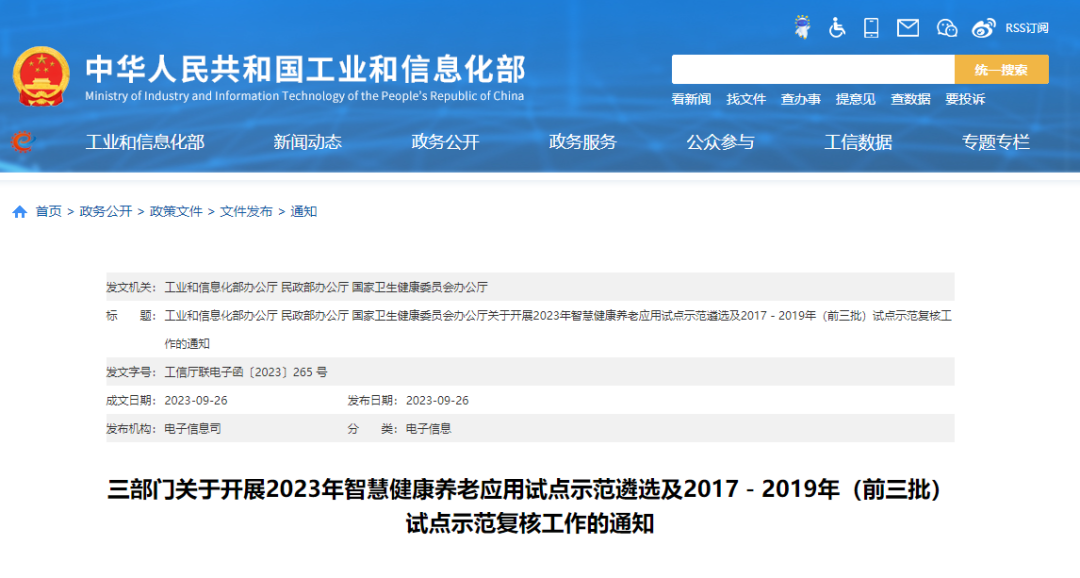 為貫徹落實(shí)《國(guó)務(wù)院辦公廳關(guān)于推進(jìn)養(yǎng)老服務(wù)發(fā)展的意見》(國(guó)辦發(fā)〔2019〕5號(hào)),按照《智慧健康養(yǎng)老產(chǎn)業(yè)發(fā)展行動(dòng)計(jì)劃(2021-2025年)》(工信部聯(lián)電子〔2021〕154號(hào))安排,強(qiáng)化試點(diǎn)示范引領(lǐng)效應(yīng),加強(qiáng)動(dòng)態(tài)管理,工業(yè)和信息化部、民政部、國(guó)家衛(wèi)生健康委決定組織開展2023年智慧健康養(yǎng)老應(yīng)用試點(diǎn)示范遴選和2017-2019年(前三批)智慧健康養(yǎng)老應(yīng)用試點(diǎn)示范復(fù)核工作。有關(guān)事項(xiàng)通知如下。