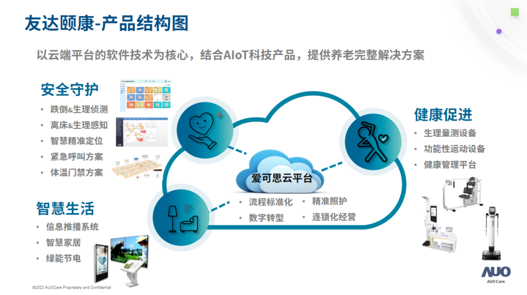 以云端平臺(tái)的軟件技術(shù)為核心,結(jié)合AIoT科技產(chǎn)品,提供養(yǎng)老完整解決方案。