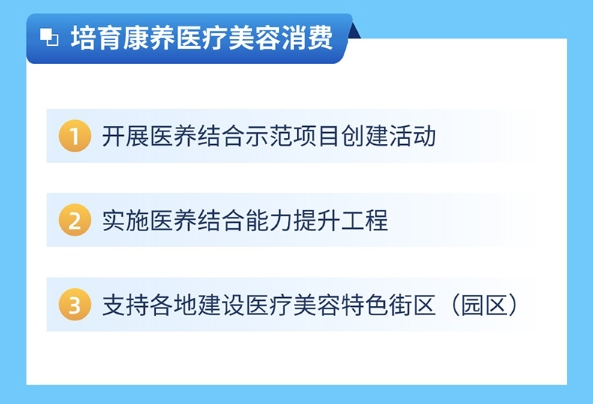 (十五)培育康養(yǎng)醫(yī)療美容消費。開展醫(yī)養(yǎng)結(jié)合示范項目創(chuàng)建活動,評選4家全國醫(yī)養(yǎng)結(jié)合示范機(jī)構(gòu)、10家省級醫(yī)養(yǎng)結(jié)合示范機(jī)構(gòu)。實施醫(yī)養(yǎng)結(jié)合能力提升工程,推動醫(yī)養(yǎng)康養(yǎng)融合發(fā)展。支持各地建設(shè)醫(yī)療美容特色街區(qū)(園區(qū)),支持廣州打造“南方美谷”,支持深圳打造“醫(yī)美之都”,支持橫琴粵澳深度合作區(qū)打造大灣區(qū)國際療養(yǎng)中心。加強(qiáng)行業(yè)監(jiān)管,引導(dǎo)醫(yī)療美容行業(yè)規(guī)范發(fā)展壯大。(各地級以上市人民政府,橫琴粵澳深度合作區(qū)執(zhí)委會,省衛(wèi)生健康委、市場監(jiān)管局按職責(zé)分工負(fù)責(zé))