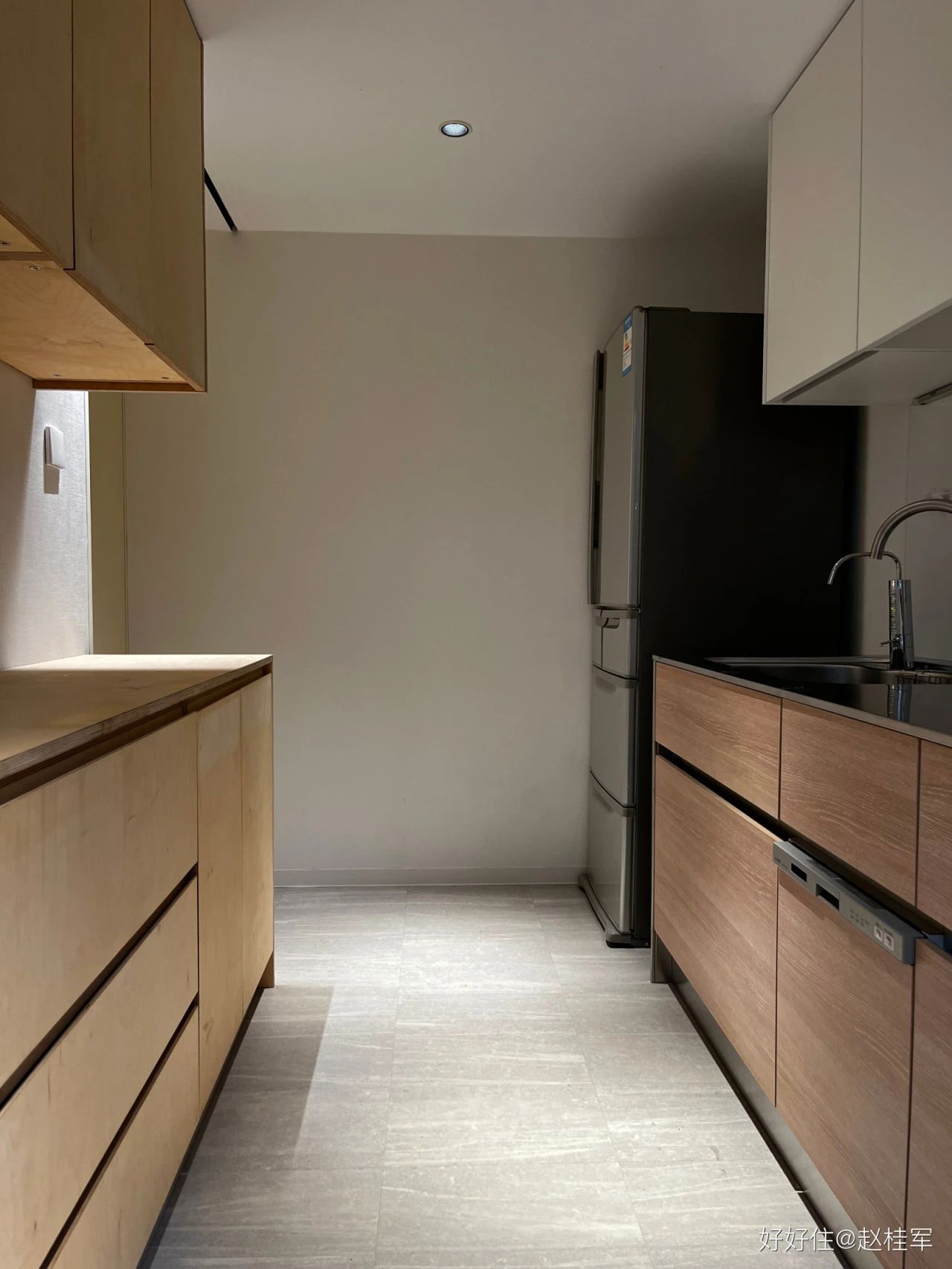 櫥柜是日本進口 sanwa 整體櫥柜,原木色+白色,再配上不銹鋼操作臺面,整個空間簡潔大方,便于清潔。