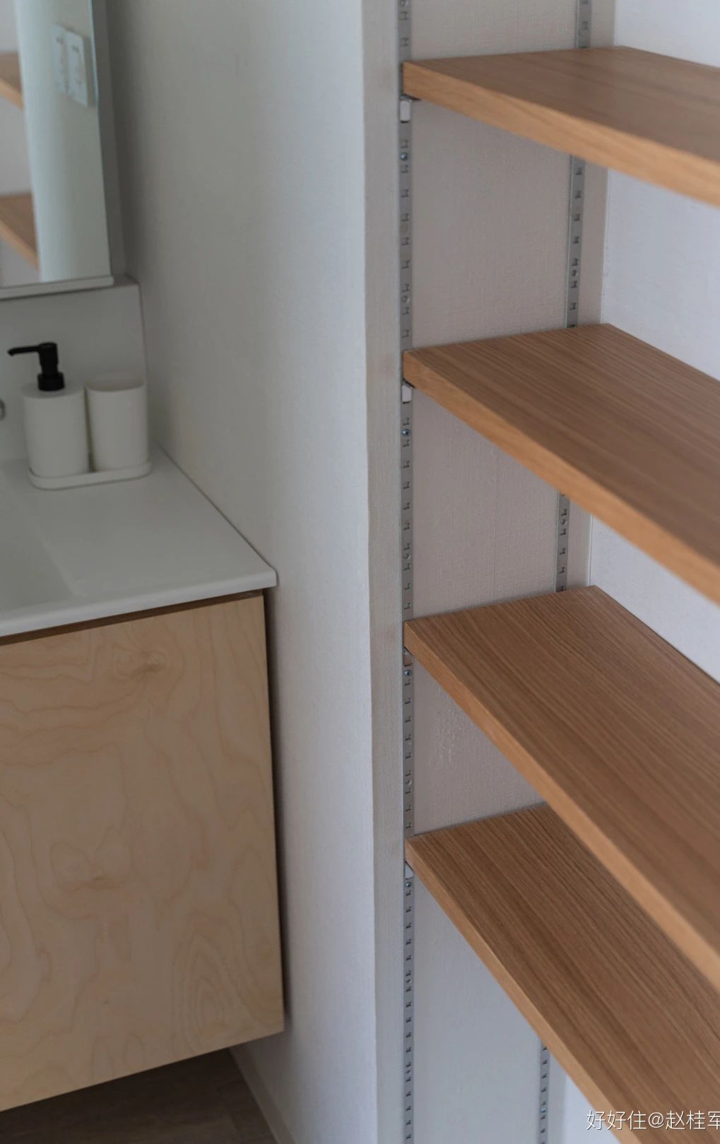 原有門洞做了 LAMP 層板托架,讓很小的衛(wèi)生間也有了更多的收納空間。