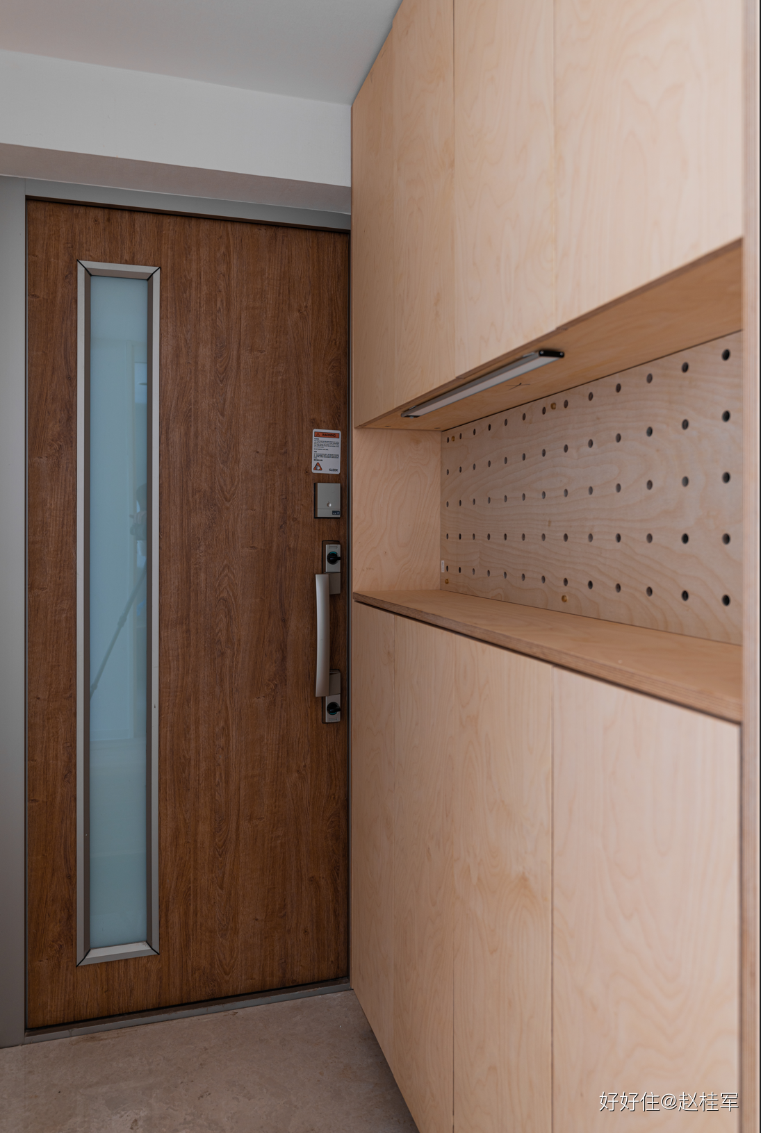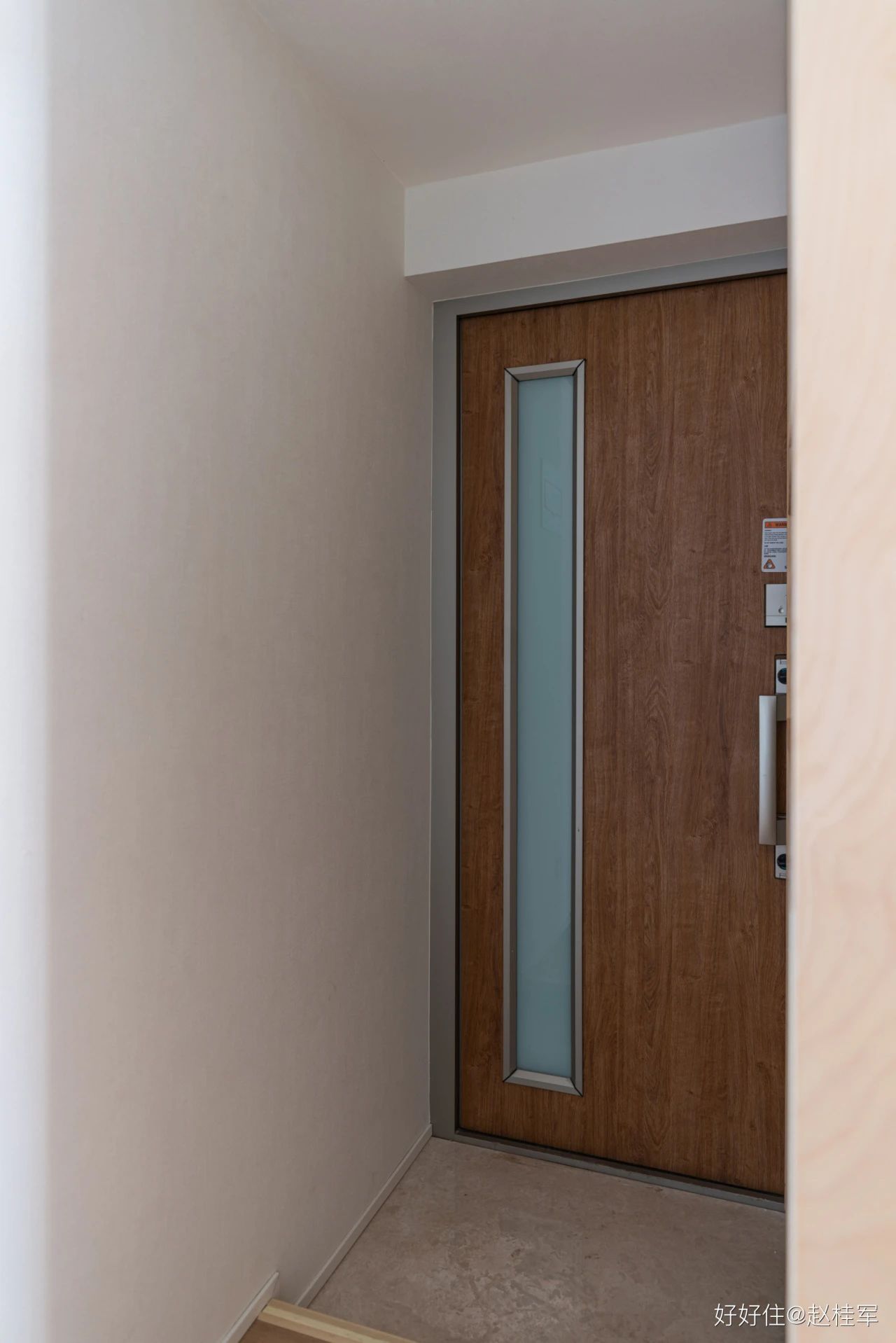 玄關(guān)地面和室內(nèi)地面形成的高度差,減少塵土帶入,讓室內(nèi)更干凈。進門右面墻面預(yù)制結(jié)構(gòu)板,以便后期加裝折疊凳。