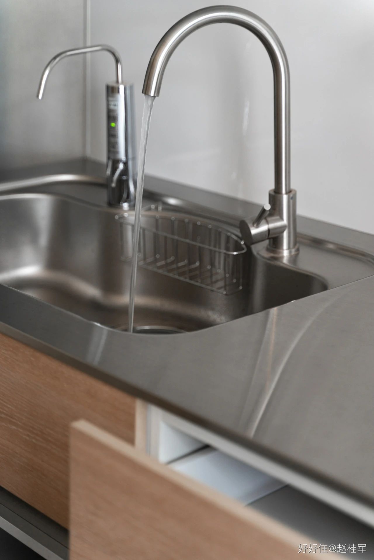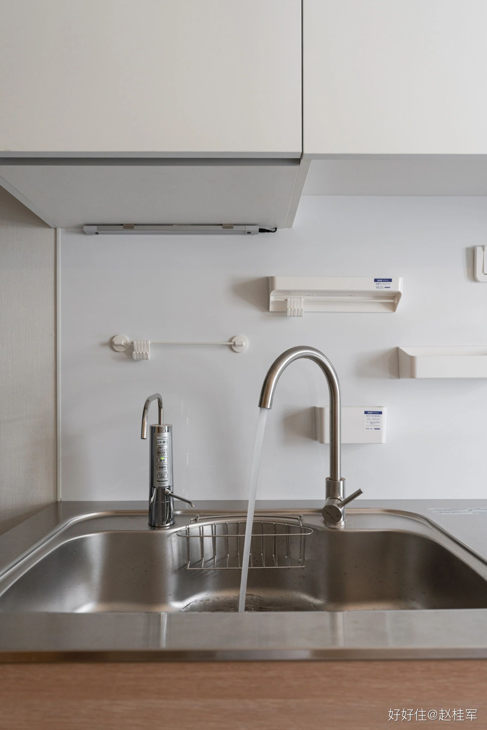 櫥柜采用無隔板設(shè)計,可輕松收納鍋具、餐具等物件。水槽龍頭用了兩款,洗菜龍頭是 KVK 5021T,另一款是松下水素水 TK-HB50。