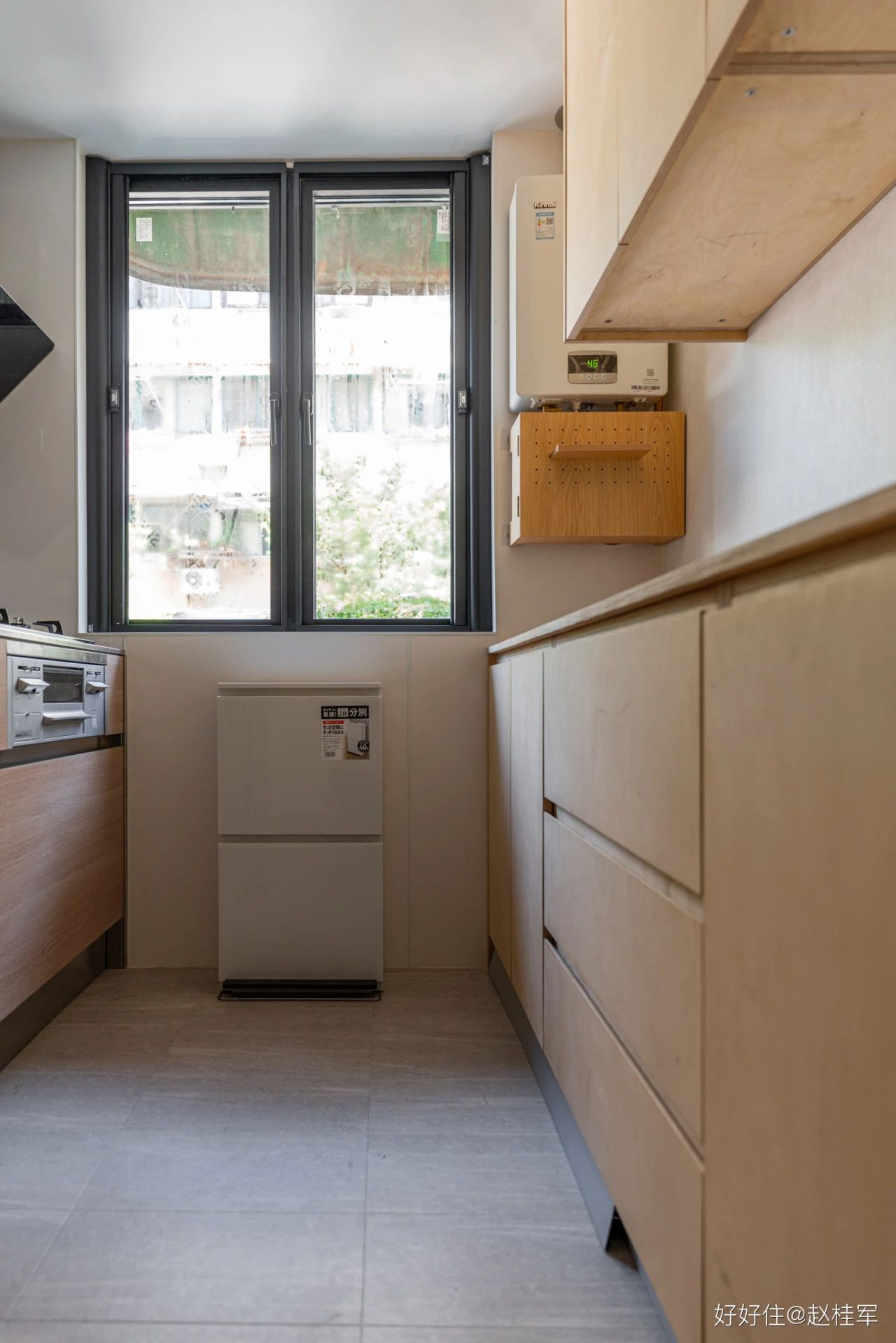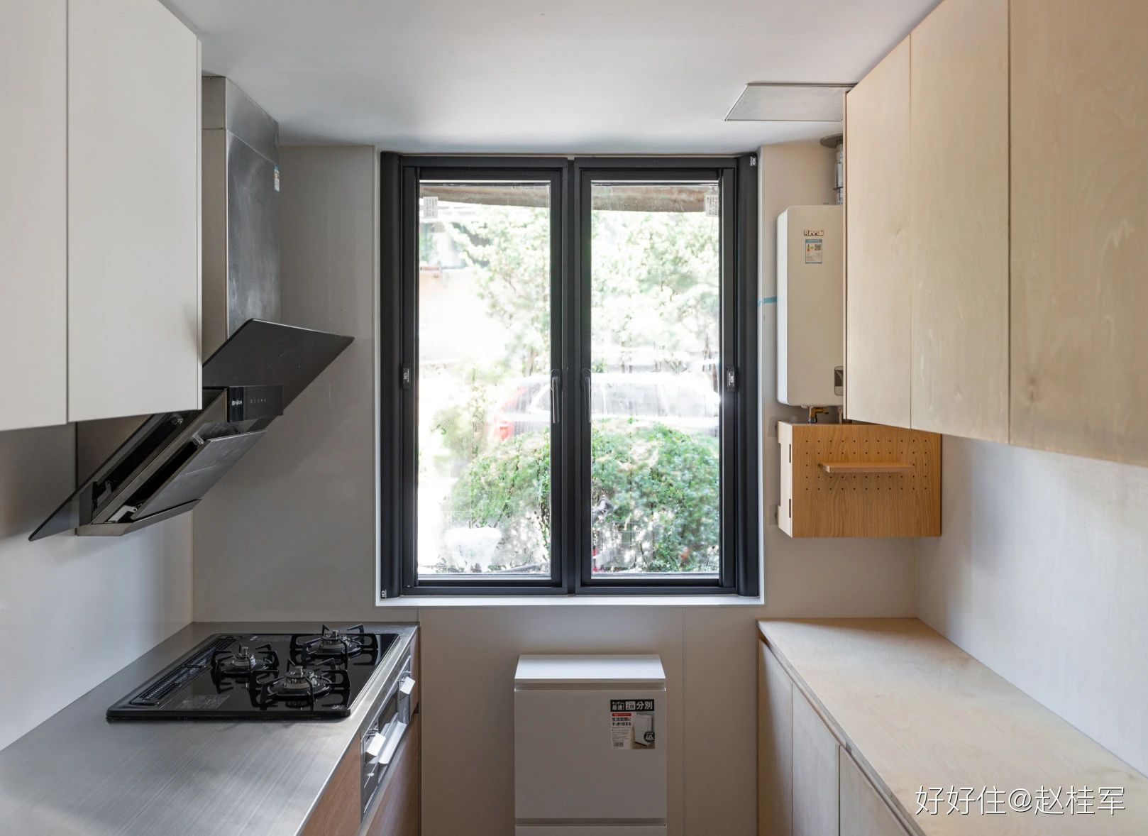 廚房整個操作動線直接了當(dāng),盡頭的一扇窗戶,給空間留足光照,讓廚房更顯通透。