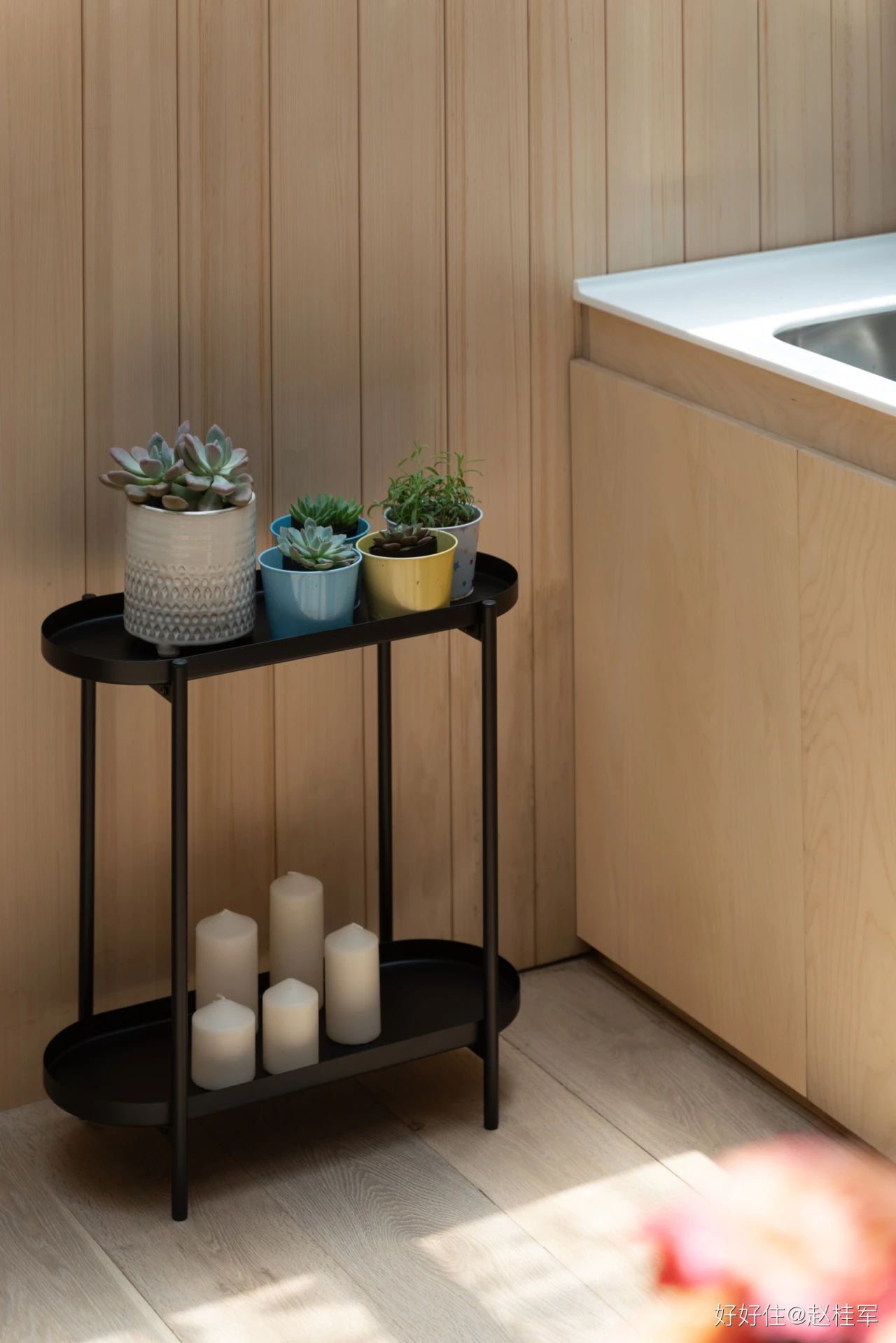 另一側(cè)則是做了開放式的收納格,可以收納一些書和小物。將陽臺重新利用后,這里不只是用餐區(qū),也是一個集閱讀、工作、家務(wù)、植物為一體的多功能空間。