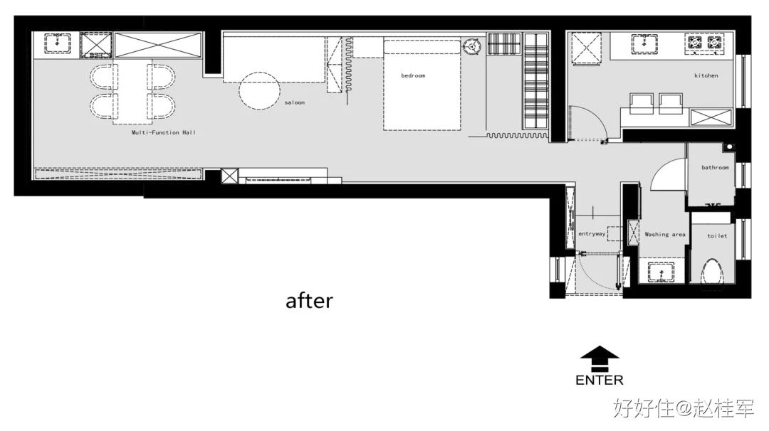 ④大開間將客廳、臥室和衣帽間規(guī)劃在一起;