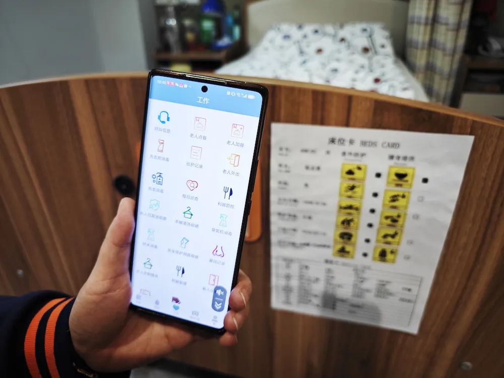 ▲養(yǎng)老院的工作人員通過手機(jī)對老人的信息進(jìn)行查詢、管理
