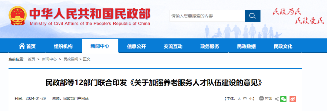近日,為深入實(shí)施積極應(yīng)對(duì)人口老齡化國(guó)家戰(zhàn)略和新時(shí)代人才強(qiáng)國(guó)戰(zhàn)略,民政部、國(guó)家發(fā)展改革委、教育部、財(cái)政部、人力資源社會(huì)保障部、住房城鄉(xiāng)建設(shè)部、農(nóng)業(yè)農(nóng)村部、商務(wù)部、國(guó)家衛(wèi)生健康委、市場(chǎng)監(jiān)管總局、稅務(wù)總局、全國(guó)老齡辦等12部門(mén)聯(lián)合印發(fā)了《關(guān)于加強(qiáng)養(yǎng)老服務(wù)人才隊(duì)伍建設(shè)的意見(jiàn)》(以下簡(jiǎn)稱(chēng)《意見(jiàn)》)。