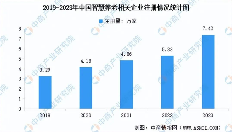 我國智慧養(yǎng)老企業(yè)數(shù)量眾多,根據(jù)企查查數(shù)量顯示,截至2023年底我國現(xiàn)存智慧養(yǎng)老企業(yè)總數(shù)達(dá)到39.90萬家。從智慧養(yǎng)老產(chǎn)業(yè)相關(guān)企業(yè)歷年注冊量來看,在巨大的養(yǎng)老需求下,企業(yè)注冊量呈逐年增長趨勢,由2019年的3.29萬家增長至2023年的7.42萬家,復(fù)合年均增長率達(dá)22.55%。