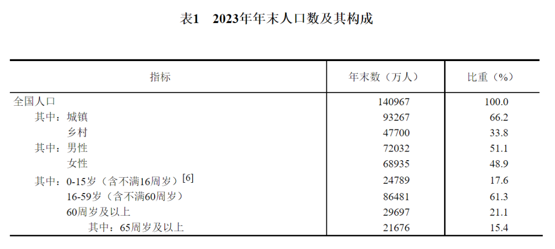 2023年末全國人口140967萬人,比上年末減少208萬人,其中城鎮(zhèn)常住人口93267萬人。全年出生人口902萬人,出生率為6.39‰;死亡人口1110萬人,死亡率為7.87‰;自然增長率為-1.48‰。