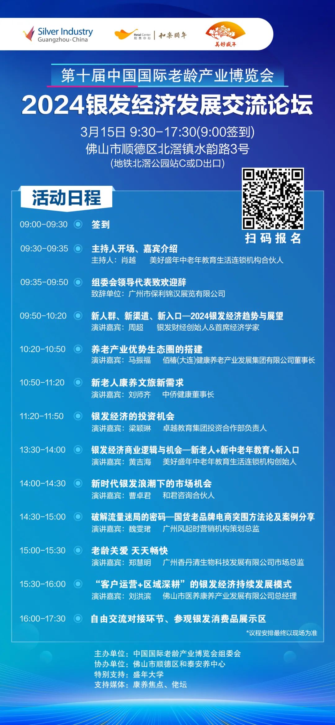 2024年3月15日,中國(guó)國(guó)際老齡產(chǎn)業(yè)博覽會(huì)組委會(huì)聯(lián)合和泰中心、盛年大學(xué)將于廣東佛山舉辦2024第二屆銀發(fā)經(jīng)濟(jì)發(fā)展交流論壇,屆時(shí)將邀請(qǐng)大健康/老年文旅/老年鞋服等領(lǐng)先消費(fèi)用品企業(yè)進(jìn)行主題演講,助力培育經(jīng)濟(jì)發(fā)展新動(dòng)能。