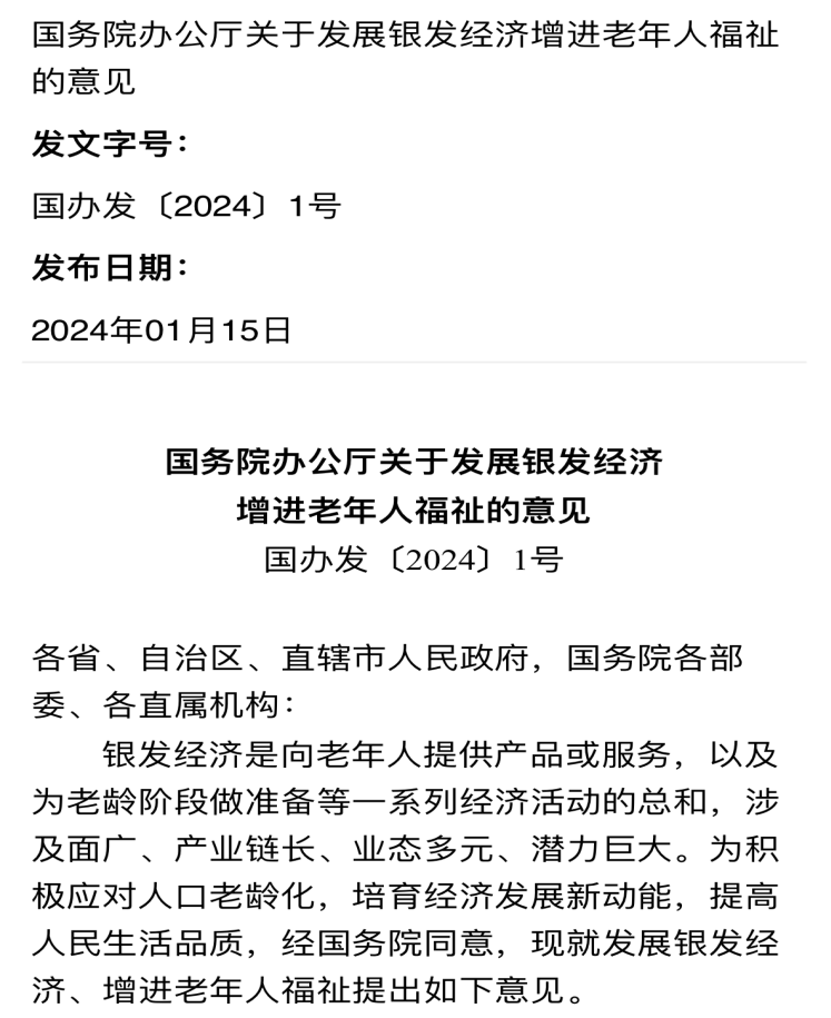 2024年1月15日正式發(fā)布的《國務院辦公廳關(guān)于發(fā)展銀發(fā)經(jīng)濟增進老年人福祉的意見》指出了許多未來康養(yǎng)發(fā)展的新方向,尤其是第十七條所指出的“發(fā)展抗衰老產(chǎn)業(yè)”: