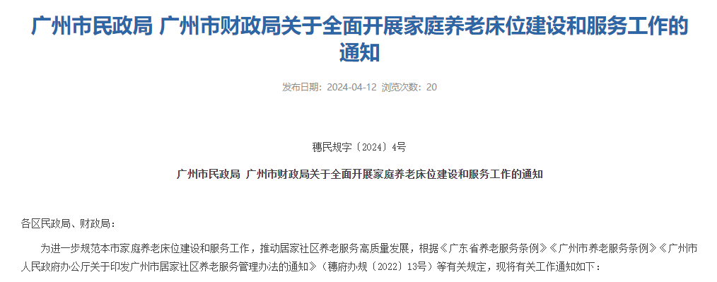廣州市民政局 廣州市財政局關(guān)于全面開展家庭養(yǎng)老床位建設(shè)和服務(wù)工作的通知