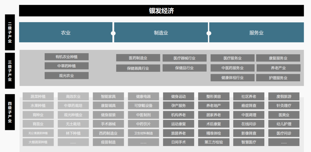 各地積極發(fā)展銀發(fā)經(jīng)濟(jì),瞄準(zhǔn)以銀發(fā)經(jīng)濟(jì)與農(nóng)業(yè)、制造業(yè)、服務(wù)業(yè)結(jié)合構(gòu)建的多元化產(chǎn)業(yè)集群,并形成了多級細(xì)分子產(chǎn)業(yè)。