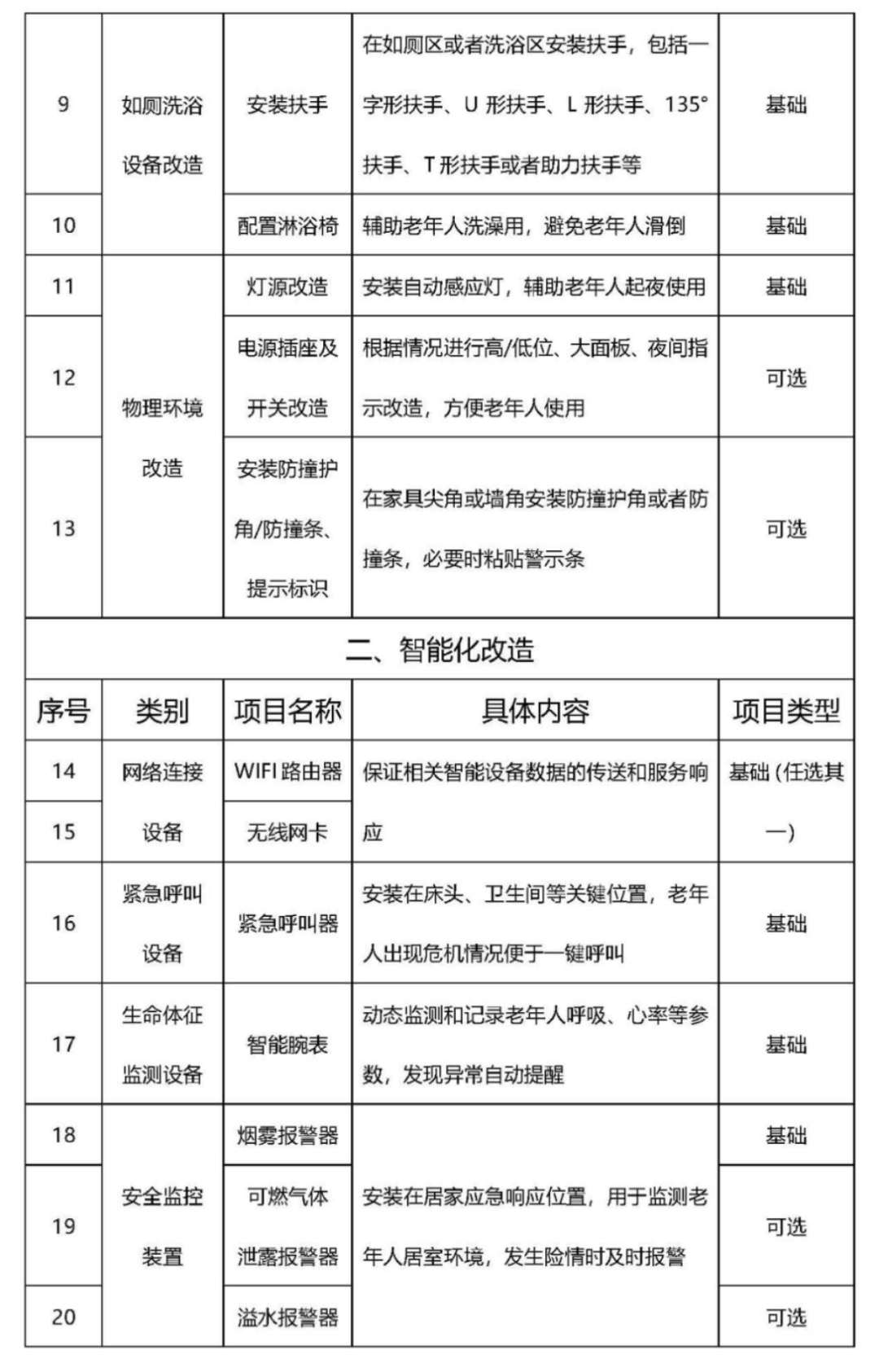 (一)建設(shè)家庭養(yǎng)老床位。根據(jù)服務(wù)對象失能狀況、居家環(huán)境條件等情況并結(jié)合其意愿,對其居家環(huán)境關(guān)鍵區(qū)域或部位進(jìn)行適老化改造,按需安裝網(wǎng)絡(luò)連接、緊急呼叫、活動監(jiān)測等智能化設(shè)備,并視情配備助行、助餐、感知類老年用品。此前已進(jìn)行相關(guān)改造并具備相應(yīng)功能的不重復(fù)改造(適老化改造、智能化改造和老年用品配備可參考附1)。建設(shè)的家庭養(yǎng)老床位應(yīng)有效增強(qiáng)服務(wù)對象居家生活的安全性、便利性和舒適性,并能夠通過智能化手段進(jìn)行遠(yuǎn)程監(jiān)測和動態(tài)管理,對服務(wù)對象服務(wù)需求和異常情況及時響應(yīng)和進(jìn)行應(yīng)急處置。