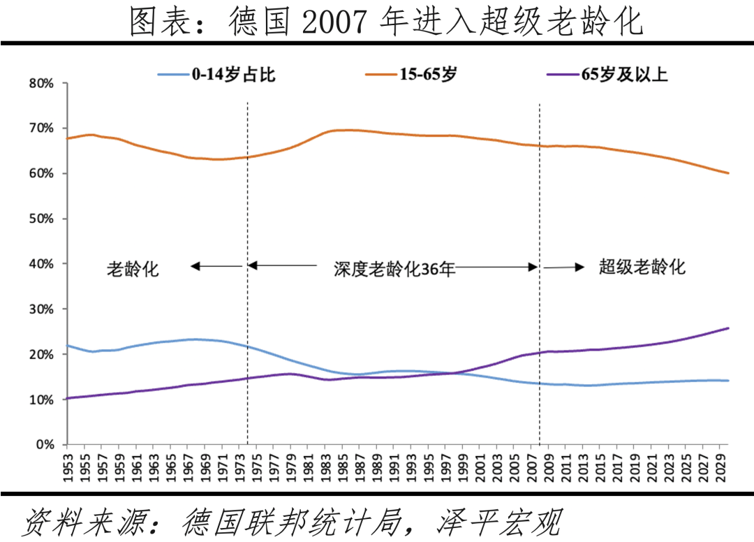 德國(guó)老齡化發(fā)展歷程更為典型,具有“進(jìn)入早、速度慢、程度深”的特征。從老齡化程度看,德國(guó)在1930年代左右進(jìn)入65歲及以上老年人口占比7%的老齡化社會(huì),1971年65歲及以上人口占比突破14%,進(jìn)入深度老齡化社會(huì);2007年占比超過(guò)20%,進(jìn)入超級(jí)老齡化社會(huì)。2023年德國(guó)65歲及以上人口占比22.1%,為歐盟國(guó)家中老齡化程度較高的國(guó)家。從老齡化速度看,德國(guó)從老齡化過(guò)渡到深度老齡化用了約41年,從深度老齡化到超級(jí)老齡化用了36年。