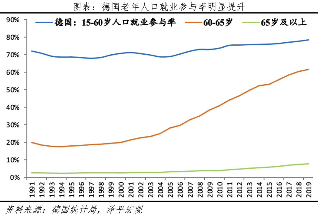 4)實(shí)施漸進(jìn)式延遲退休政策,至2031年延長(zhǎng)至67歲,補(bǔ)充社會(huì)勞動(dòng)力,2000-2019年60-65歲老年人口就業(yè)參與率增加41.8個(gè)百分點(diǎn)。2007年德國(guó)聯(lián)邦會(huì)議通過(guò)法案規(guī)定,從2012年開(kāi)始漸進(jìn)式提高法定退休年齡,以月為單位遞增,其中2012-2023年每年延長(zhǎng)一個(gè)月,2024-2029年每年延長(zhǎng)兩個(gè)月,也就是說(shuō)到2023年退休年齡延長(zhǎng)至66歲、2031年延長(zhǎng)至67歲。為了滿(mǎn)足一部分特殊人群退休需求,政策補(bǔ)充規(guī)定繳滿(mǎn)45年養(yǎng)老保險(xiǎn)的人在63歲可領(lǐng)取全額養(yǎng)老金,對(duì)于殘障人士和特殊工種人士可申請(qǐng)?zhí)崆巴诵?。根?jù)德國(guó)統(tǒng)計(jì)局?jǐn)?shù)據(jù),2000-2019年德國(guó)15-60歲、60-65歲、65歲及以上人口就業(yè)參與率分別增加7.6、41.8、5.2個(gè)百分點(diǎn),老年人口就業(yè)參與率增幅明顯。