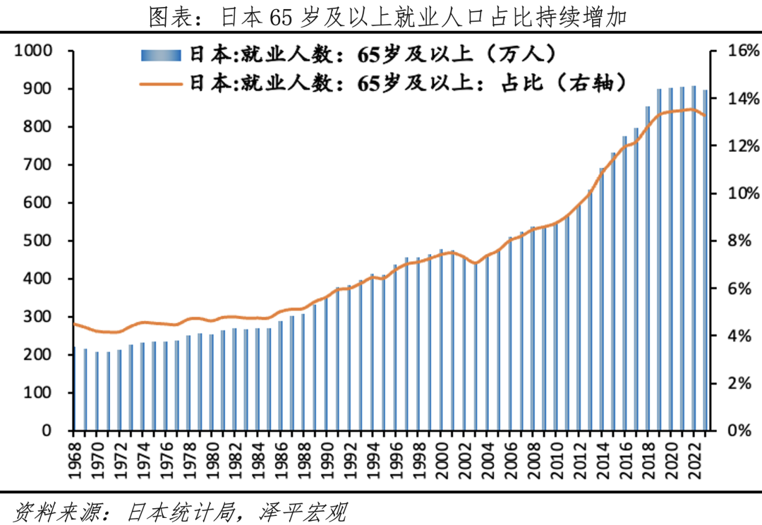 為了配合延遲退休政策實(shí)施,日本同步改革養(yǎng)老金領(lǐng)取規(guī)則,推遲養(yǎng)老金支付時(shí)間,男性到2025年領(lǐng)取養(yǎng)老金的年齡提高到65歲,女性推遲5年實(shí)施。為了減輕企業(yè)雇傭老年人的負(fù)擔(dān),日本政府給雇傭老年人的企業(yè)提供補(bǔ)助,大公司每雇傭一位老人國(guó)家給予50萬(wàn)日元及以上的補(bǔ)助金,給予小公司90萬(wàn)日元及以上的補(bǔ)助金。根據(jù)日本統(tǒng)計(jì)局?jǐn)?shù)據(jù),1970-2023年日本65歲以上就業(yè)人口占比從4.2%增至13.3%。