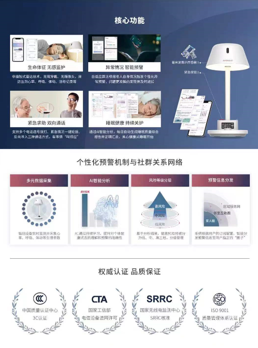 致力于打造人工智能與數(shù)字化驅(qū)動的適老科技產(chǎn)品,為萬千家庭提供人性化、全方位的智能化養(yǎng)老解決方案,從“安全”、“健康”、“照護(hù)”、“陪伴”等生活全場景,服務(wù)于中國長者。