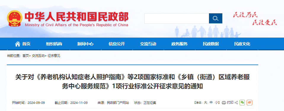 關(guān)于對(duì)《養(yǎng)老機(jī)構(gòu)認(rèn)知癥老人照護(hù)指南》等2項(xiàng)國(guó)家標(biāo)準(zhǔn)和《鄉(xiāng)鎮(zhèn)(街道)區(qū)域養(yǎng)老服務(wù)中心服務(wù)規(guī)范》1項(xiàng)行業(yè)標(biāo)準(zhǔn)公開(kāi)征求意見(jiàn)的通知
