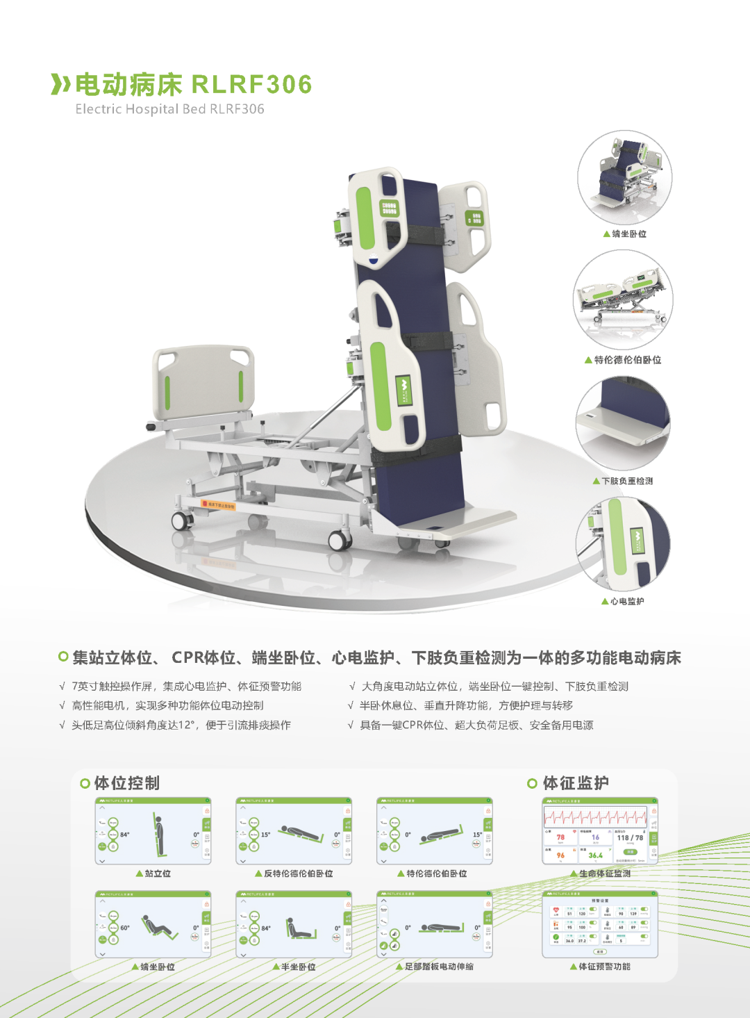 電動病床集起立床康復(fù)功能與普通病床舒適性的特點于一體, 支持站立體位、CPR體位、端坐臥位、心電監(jiān)護(hù)、下肢負(fù)重檢測,不僅能助力患者早期康復(fù)介入,還能預(yù)防因長期臥床導(dǎo)致的各種并發(fā)癥,如肌肉萎縮,血液循環(huán)問題等,通過智能調(diào)控,提升患者生活質(zhì)量和康復(fù)效率。