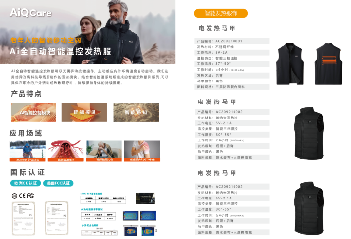 AiQCare是集團(tuán)孵化的中老年紡織品牌,屬于集團(tuán)戰(zhàn)略級(jí)定位,是集團(tuán)結(jié)合電子、紡織、高科技材料為一體的創(chuàng)新型高科技產(chǎn)品線。我們一直秉承“讓老年人的生活更舒適、更美好!”的核心理念,為老人提供中老年友好型紡織用品。主要產(chǎn)品包括黑科技?xì)⒕ギ愇都徔棶a(chǎn)品、電子發(fā)熱服飾類產(chǎn)品、EMS健康保健類產(chǎn)品、智能健康監(jiān)測(cè)類產(chǎn)品,涉及智能、健康、護(hù)理等多個(gè)領(lǐng)域。