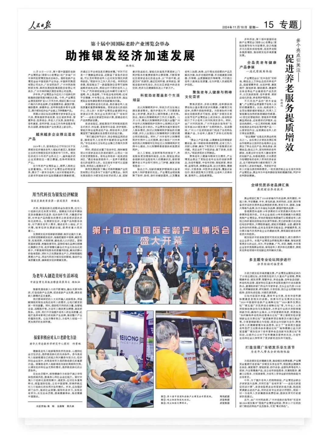 11月15-17日,第十屆中國國際老齡產(chǎn)業(yè)博覽會(SIC老博會)在廣州保利世貿(mào)博覽館成功舉辦。本屆展會規(guī)模再創(chuàng)新高,全方位呈現(xiàn)了銀發(fā)產(chǎn)業(yè)的蓬勃景象。《人民日報》對第十屆SIC老博會進行了整版專題報道。