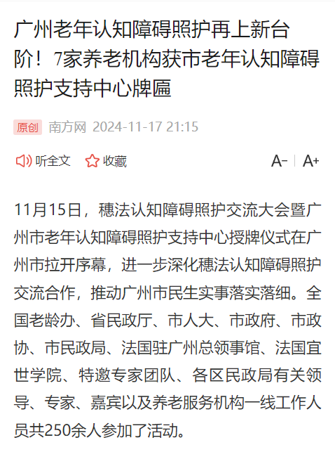 南方網(wǎng) | 廣州老年認(rèn)知障礙照護(hù)再上新臺(tái)階!7家養(yǎng)老機(jī)構(gòu)獲市老年認(rèn)知障礙照護(hù)支持中心牌匾