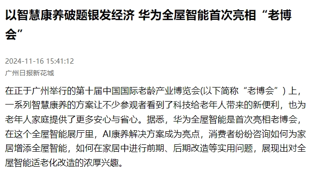 據(jù)悉,目前該方案已經(jīng)陸續(xù)在機(jī)構(gòu)養(yǎng)老方面使用,比如華為全屋智能與中國郵電器材集團(tuán)有限公司合作共創(chuàng)的智慧康養(yǎng)管理平臺(tái),圍繞養(yǎng)老護(hù)理機(jī)構(gòu)的數(shù)字化管理與監(jiān)控系統(tǒng)開展,能夠提供機(jī)構(gòu)數(shù)據(jù)概覽,整合長者基本信息、體征、護(hù)理情況等基礎(chǔ)信息,支持查看實(shí)時(shí)和歷史數(shù)據(jù)。同時(shí),還具備數(shù)字人巡更功能,通過AI技術(shù)對長者進(jìn)行主動(dòng)式巡檢,并對緊急呼叫、墜床及跌倒等高危風(fēng)險(xiǎn)事件進(jìn)行告警,大大提升了養(yǎng)老機(jī)構(gòu)運(yùn)營管理效率。