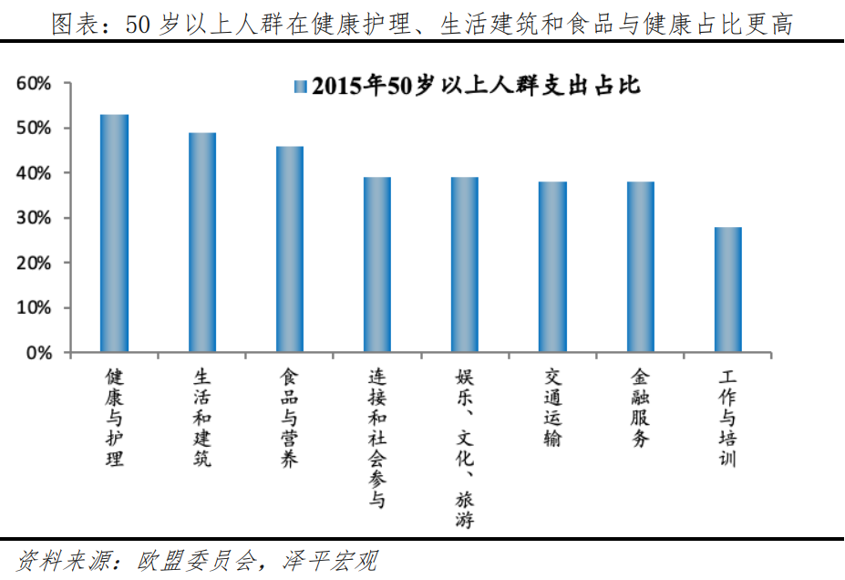 歐洲銀發(fā)經(jīng)濟(jì)發(fā)展主要集中于以下三個(gè)方面:1)基本功能性產(chǎn)品。為老年人營(yíng)造友好環(huán)境,將無(wú)障礙設(shè)施以及老年人所需要的產(chǎn)品和服務(wù)納入主流市場(chǎng)。比如醫(yī)療健康、綜合護(hù)理服務(wù)等。2)生活方式相關(guān)產(chǎn)品。在工作、生活、住房、休閑、旅行、交通等方面,滿足不同老年群體需求。比如老年友好型大學(xué)、適老化住房、功能性食品、個(gè)性化營(yíng)養(yǎng)方案、銀發(fā)旅游等。3)升級(jí)附加類產(chǎn)品。進(jìn)行科技化、智能化升級(jí),進(jìn)而拉動(dòng)新興市場(chǎng)。比如智能家居、健康管理、安全監(jiān)護(hù)、遠(yuǎn)程護(hù)理、服務(wù)機(jī)器人等。根據(jù)歐盟委員會(huì)《銀發(fā)經(jīng)濟(jì)》報(bào)告,2015年50歲以上人群支出占比前三名的行業(yè)是健康護(hù)理、生活建筑和食品與健康,分別為53%、49%、46%。